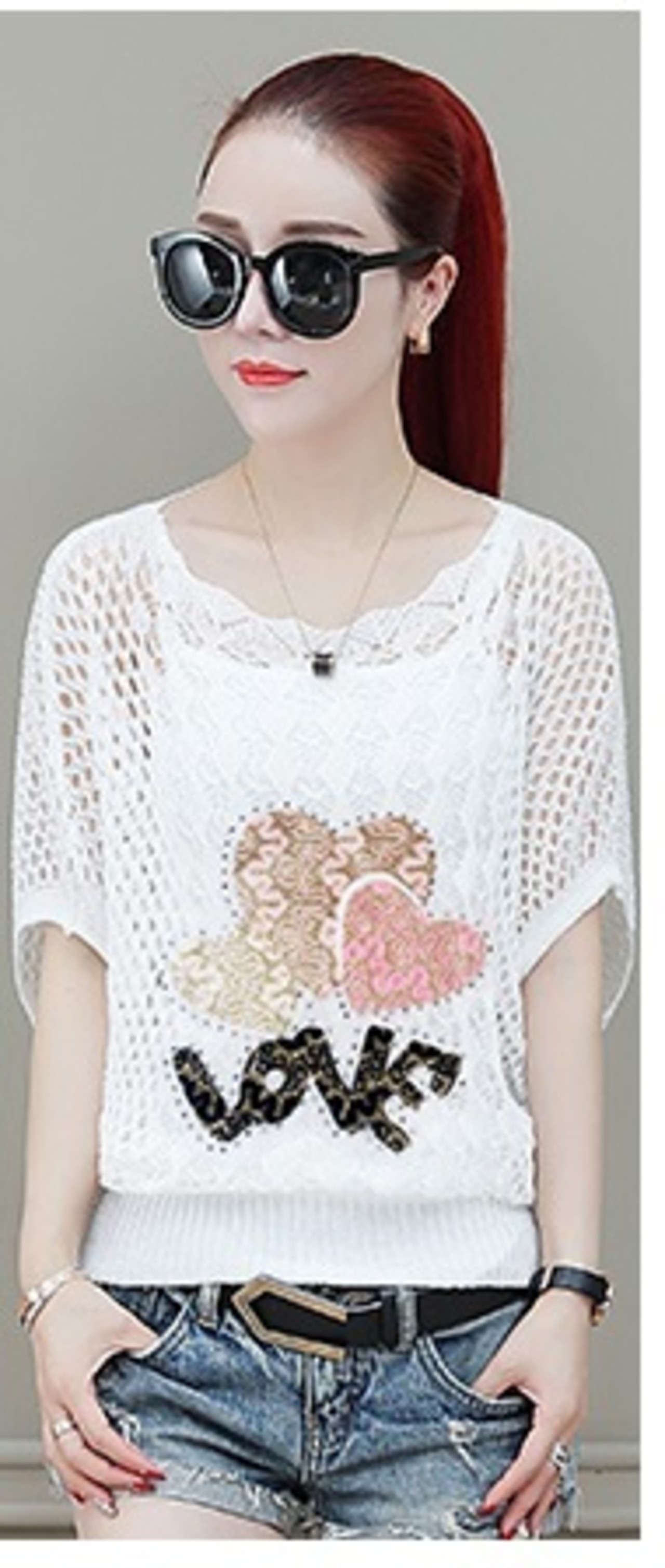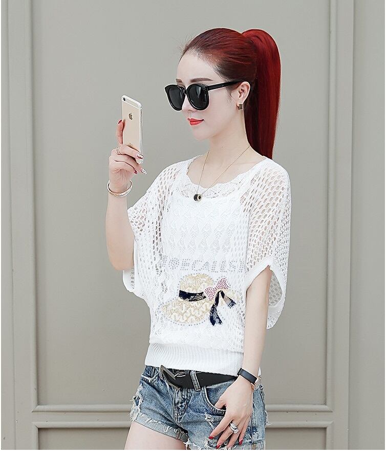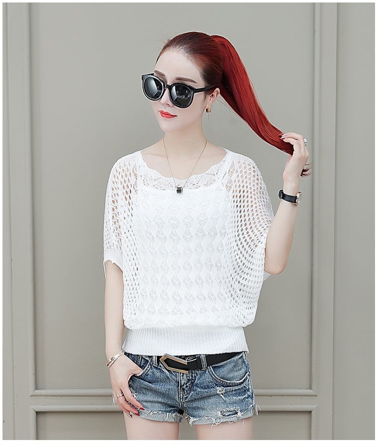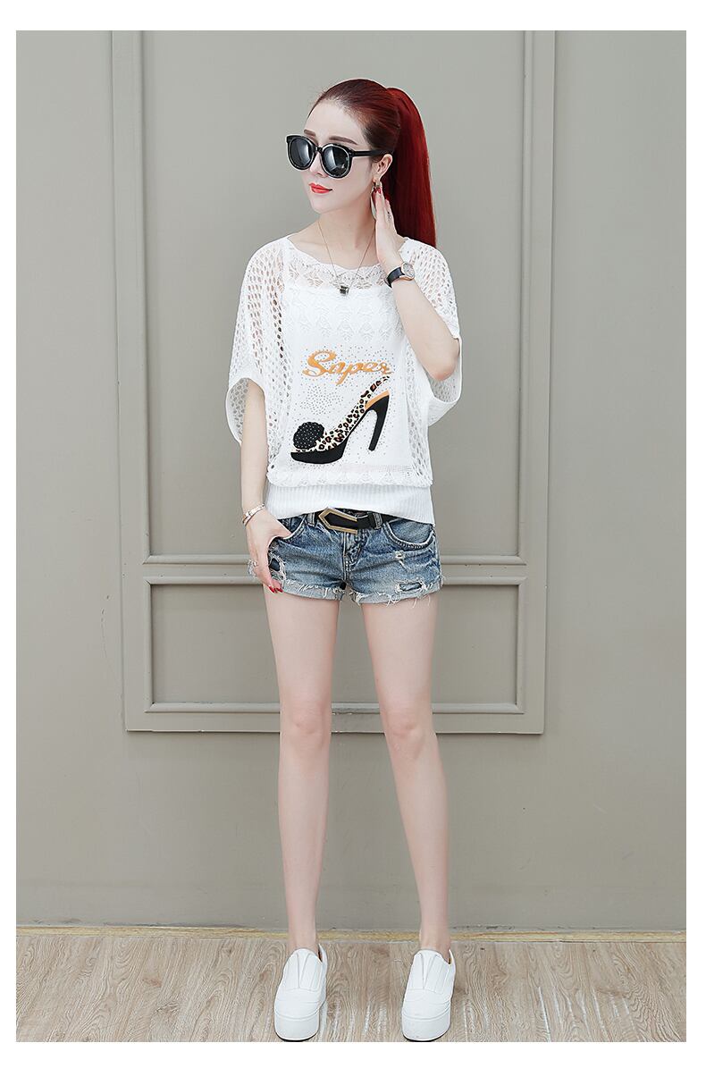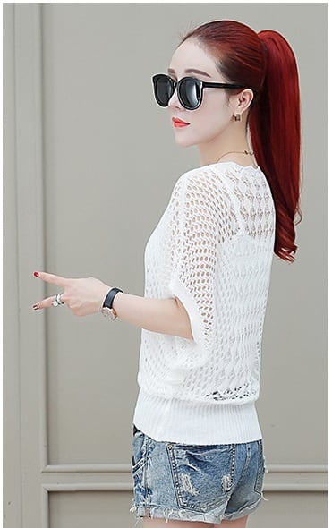 《入荷待ち》トップス サマーニット セーター 五分袖 ゆったり レディース 薄手 体型カバー ホワイト パンプス ハット ハート トレンド 透け感