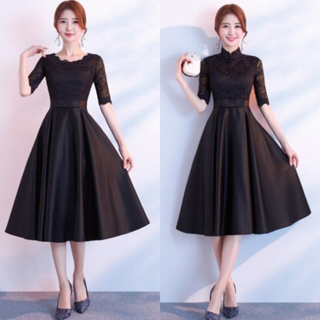 即納 数量限定 在庫あるだけ セール 超特価 パーティードレス 膝下 五分丈 ハイウエスト 切り替え ハイネック フレア 大人可愛い 総レース シンプル 華やか リボン シンプル