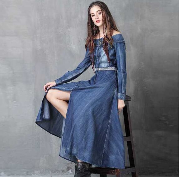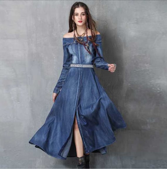 デニム ワンピース オフショルダー 長袖 ウエスト 切り替え ウエストマーク スリット 大人可愛い ロング丈 抜け感 カジュアル