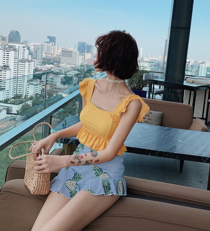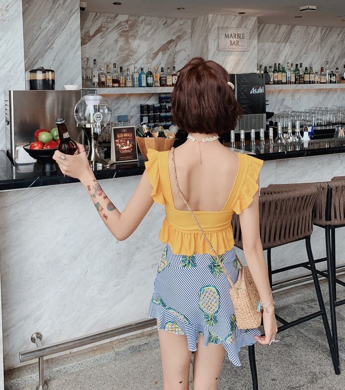 《入荷待ち》水着 スカート フリル 夏 海 スカート スリーピース マリン ソリッドカラー 可愛い リゾート パイナップル レトロ フルーツ柄