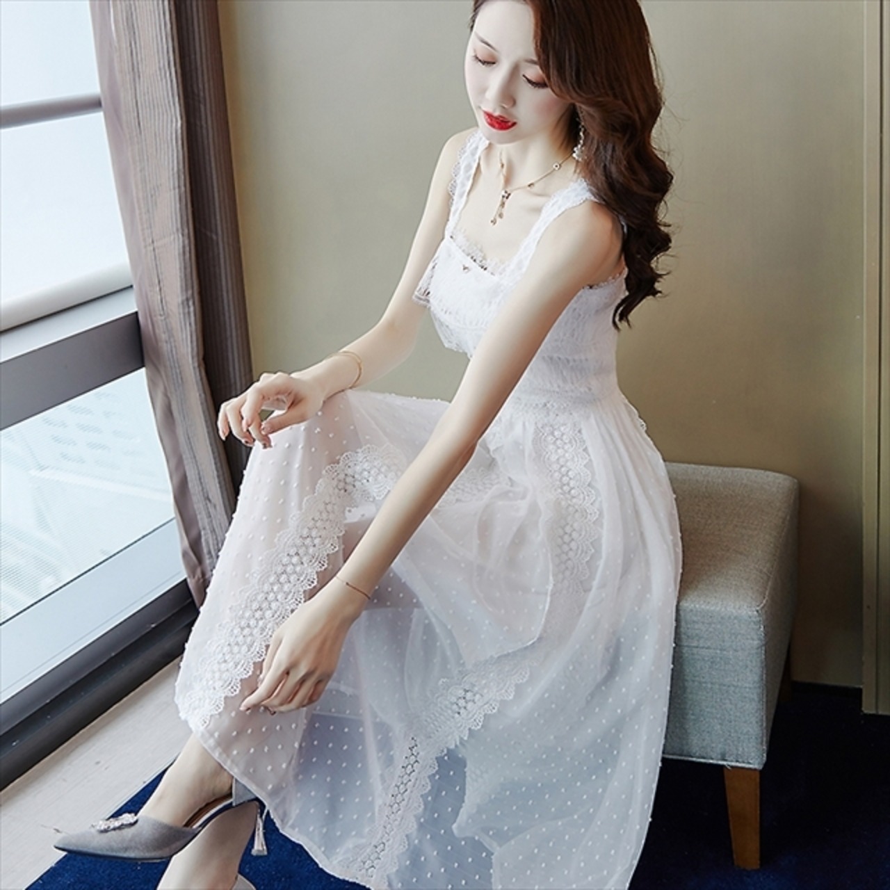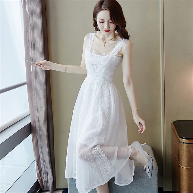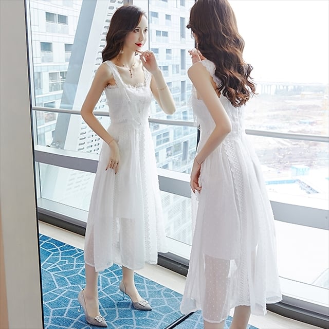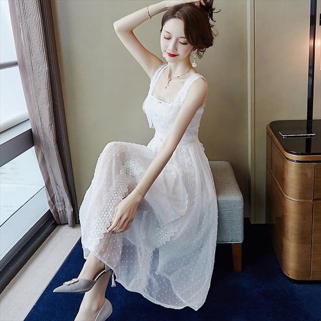 《入荷待ち》ワンピース 新作 シースルー ホワイト レース ノースリーブ ロング 無地 フェミニン 大人可愛い