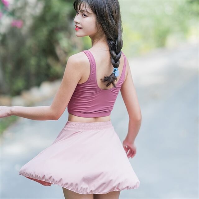 《入荷待ち》着 ビキニ ピンク シンプル タンクトップ リボン スカート 可愛い レトロ フレア プリーツ ガーリー ハイウエストボトム