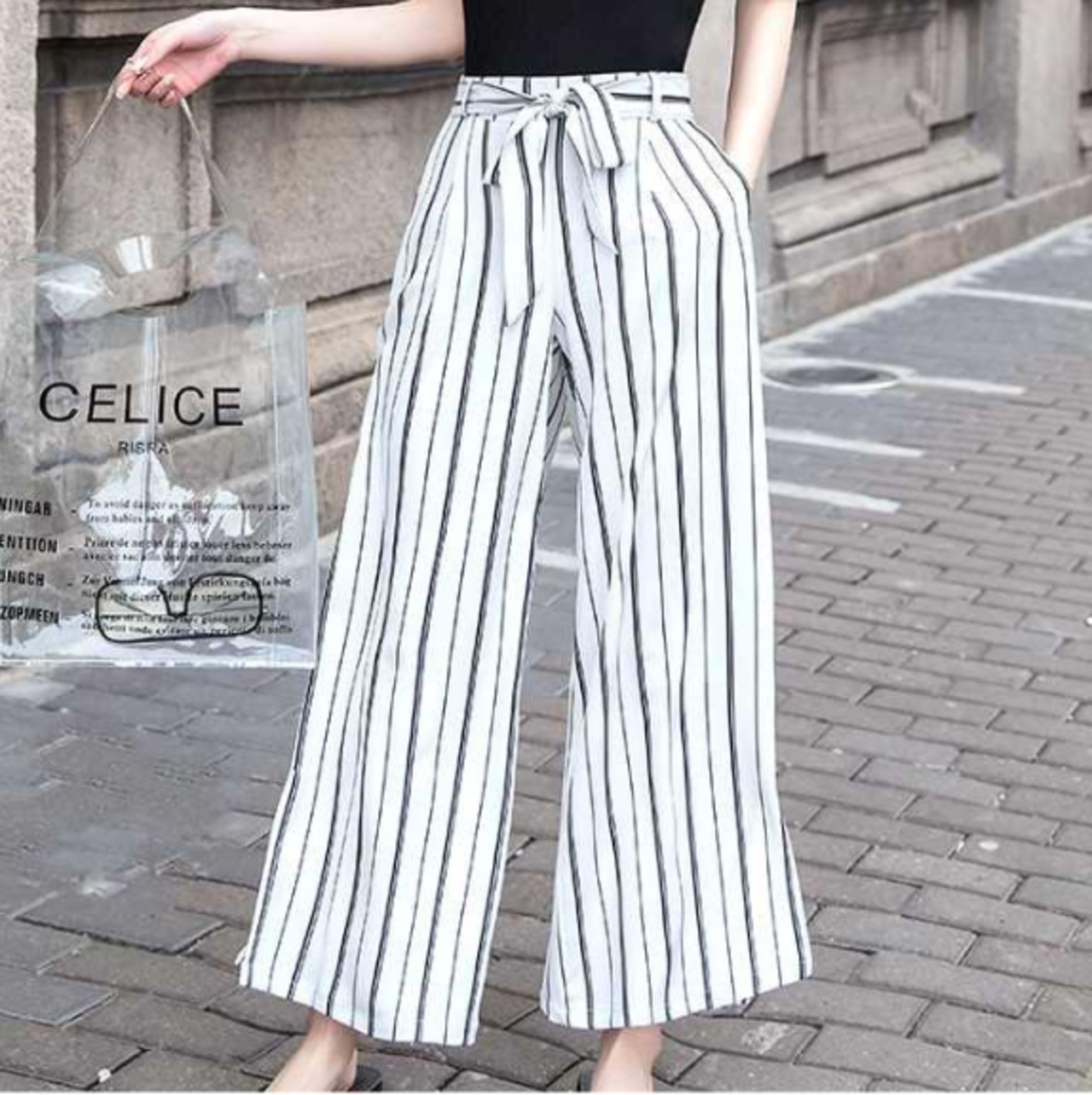 トレンドのストライプ柄ですっきりとした印象のワイドパンツです。