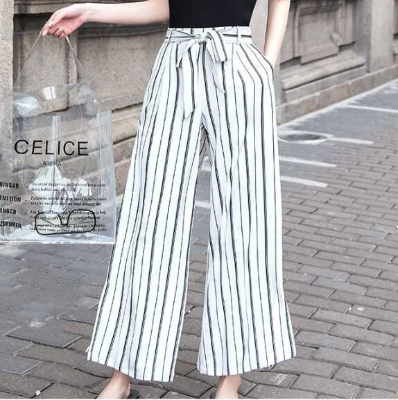 【即納】 ワイドパンツ イージーパンツ ハイウエスト ウエストマーク リボン ベルト ストライプ 爽やか キレイめ ポケット オシャレ 大きいサイズ トレンド