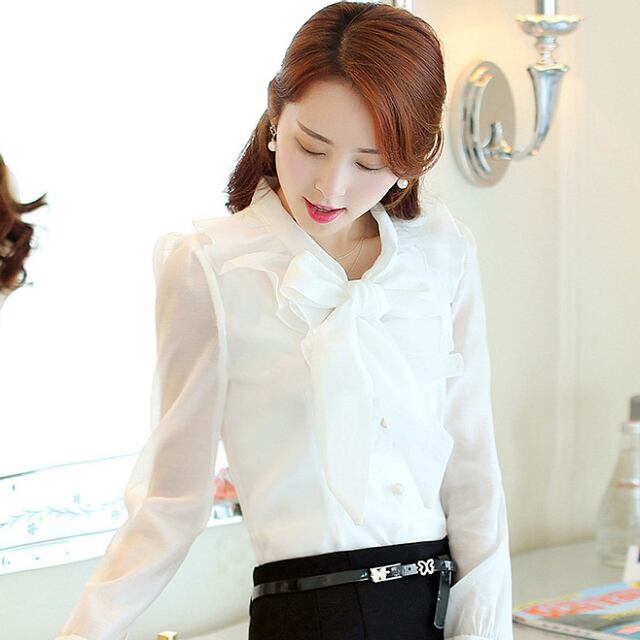 《入荷待ち》シャツ フロントリボン シフォン シースルー 長袖 オフィスカジュアル シック レディースファッション