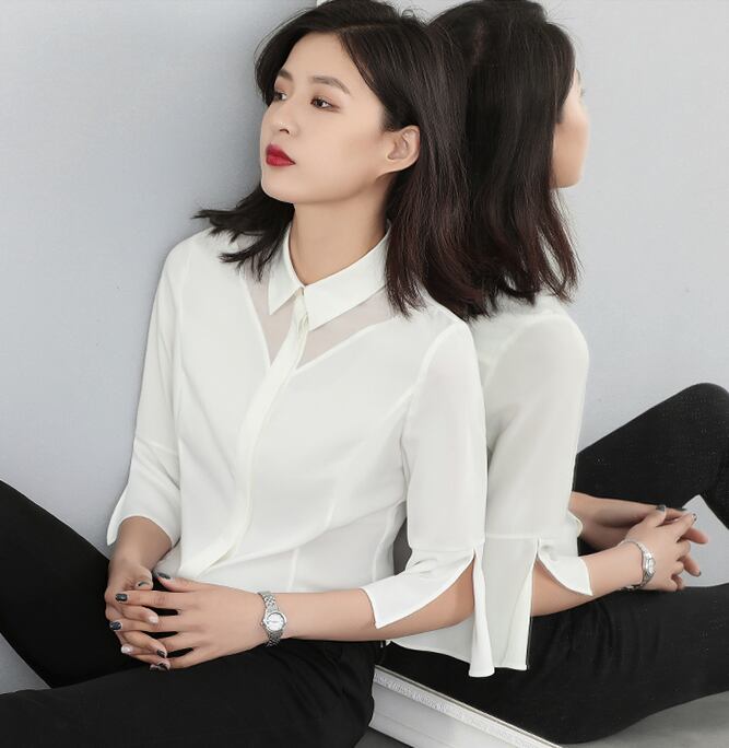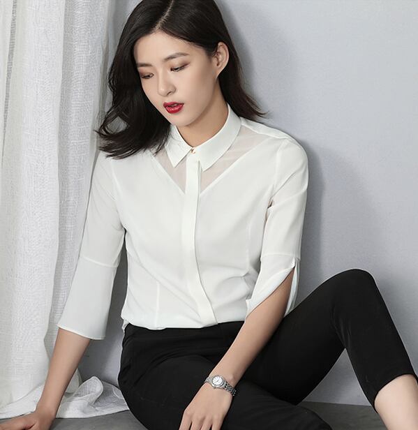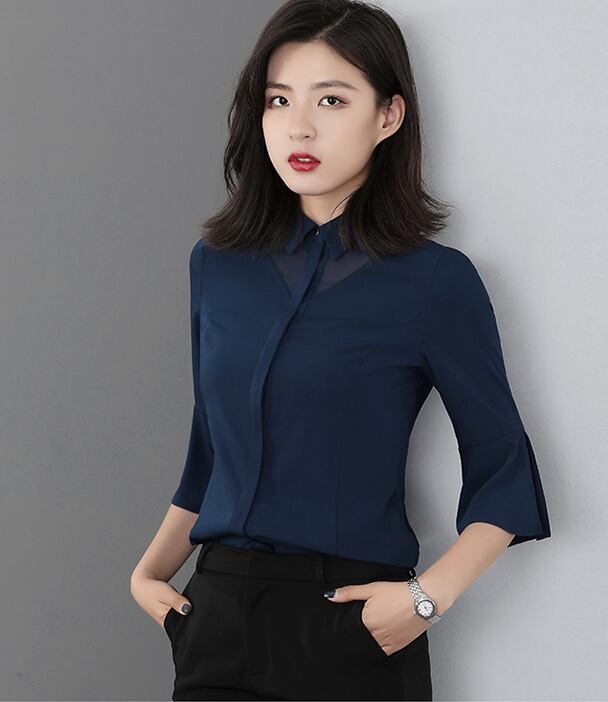 《入荷待ち》シャツ 5分袖 シック ホワイト ネイビー オフィスカジュアル 可愛い 夏 シフォン レディースファッション シンプル 無地 大きいサイズ