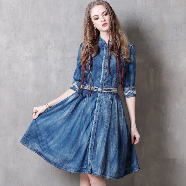 《入荷待ち》ワンピース 5分袖 デニム 刺繍 ひざ丈 ハイネック カジュアル シンプル ブルー 夏 ビンテージ 個性的 レディース ウエストマーク