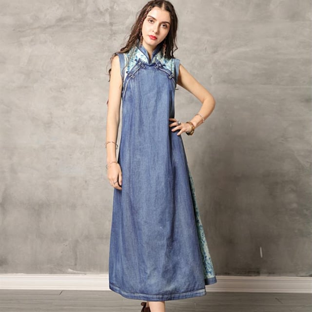まるでチャイナドレスのようなデザインのデニムワンピース。