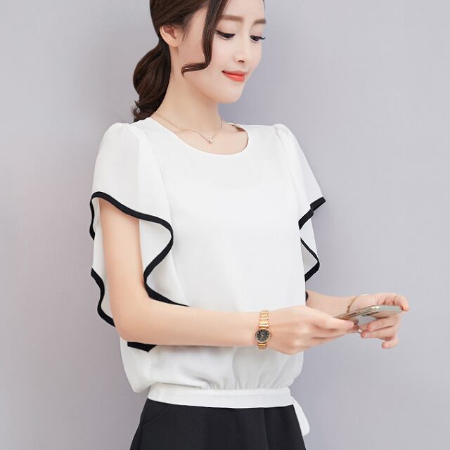 《入荷待ち》ブラウス フリル ホワイト シック 綺麗 オフィスカジュアル 無地 シンプル ラウンドネック ウエストリボン 夏 レディースファッション