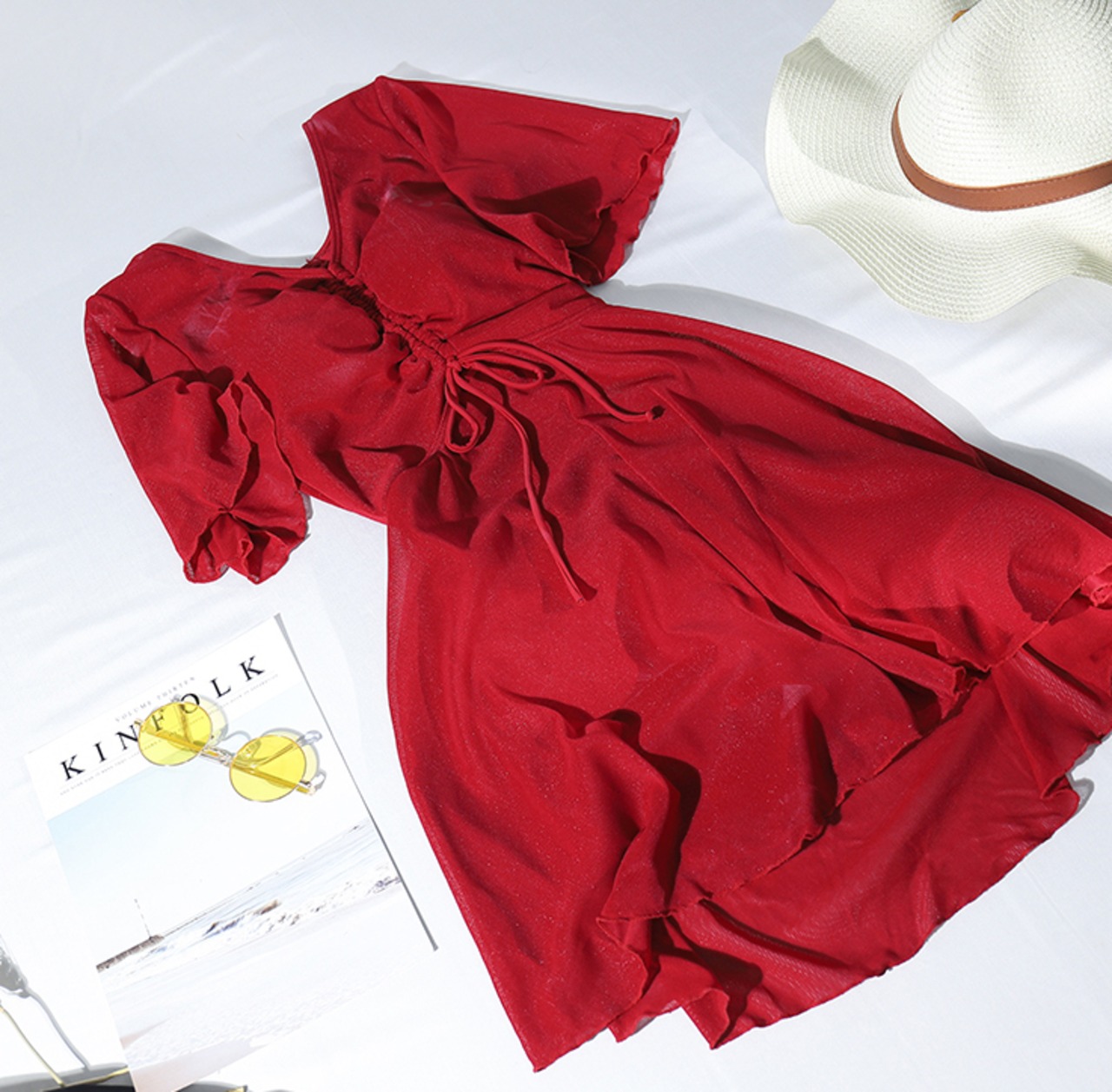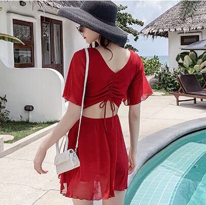 《再入荷》大きいサイズ ワンピース 水着 フリル 半袖 可愛い フロントリボン ラウンドネック 夏 海 ビーチ 無地 体型カバー 3色 レディース