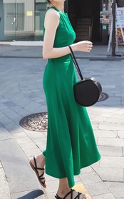 《入荷待ち》ワンピース ノースリーブ ランドネック スリット ロング丈 グリーン 無地 ドレッシー 可愛い セクシー レディース