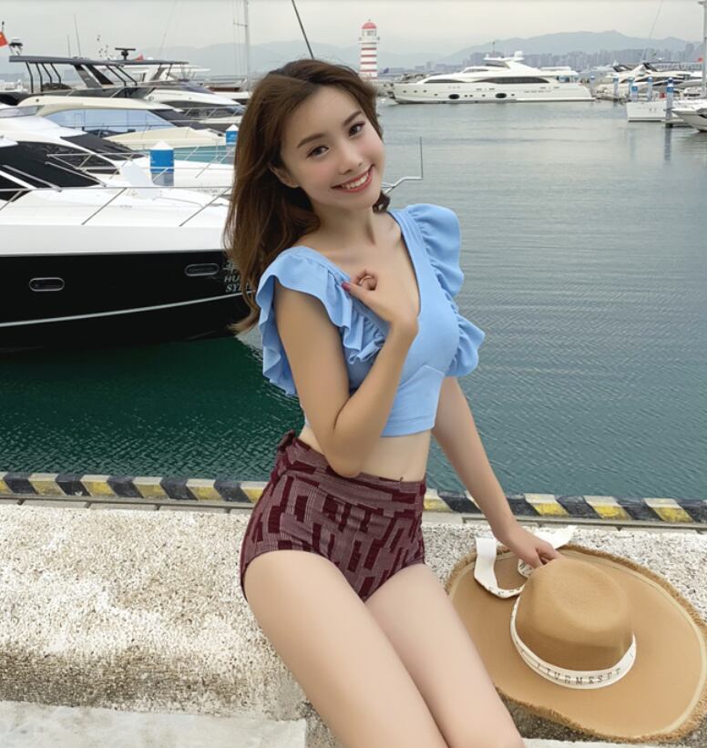 《入荷待ち》水着 ビキニ バイカラ― フリル 可愛い ハイウエスト バックリボン 夏 海 ビーチ リゾート レディース