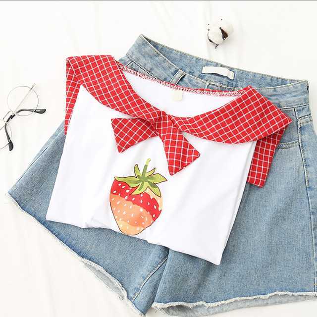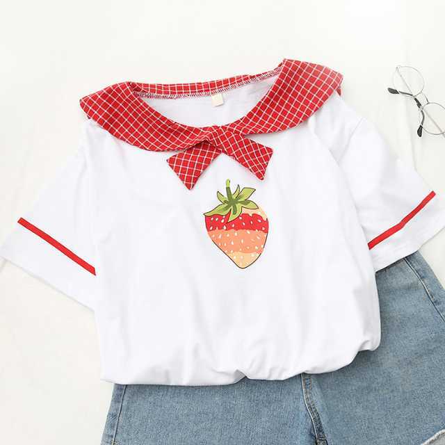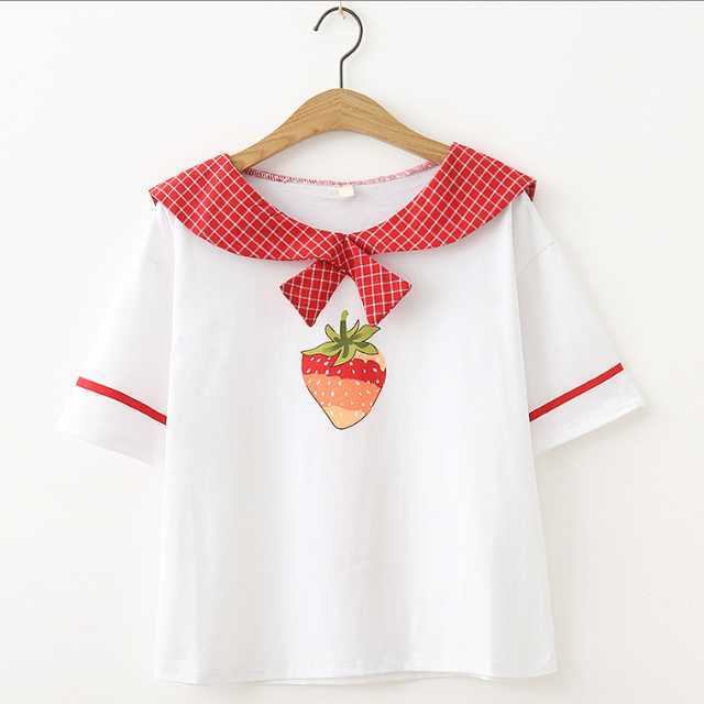 《入荷待ち》Tシャツ 苺 イチゴ いちご セーラー マリン レッド ピンク ガーリー カジュアル 可愛い キュート 半袖 オシャレ チェック プリント リボン 春 夏
