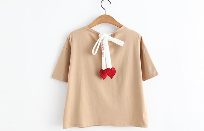 《入荷待ち》Tシャツ バックコンシャス さくらんぼ チェリー ハート リボン 半袖 ラウンドネック ガーリー 可愛い キュート デート お出かけ カジュアル 春 夏 オススメ 人気