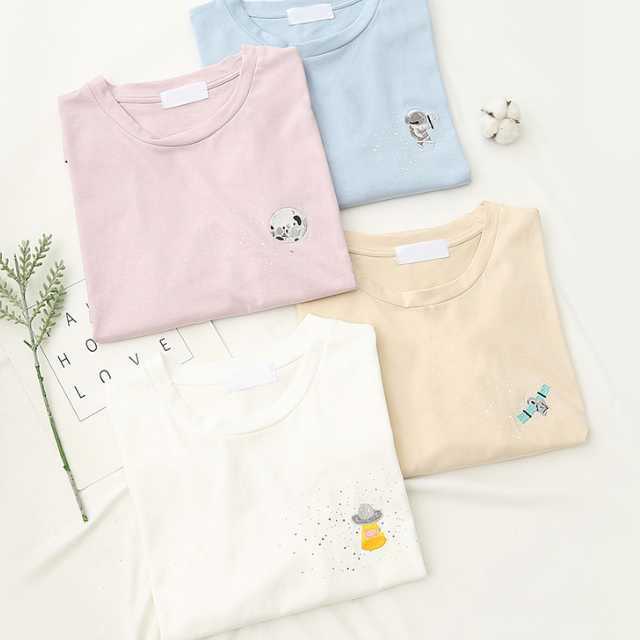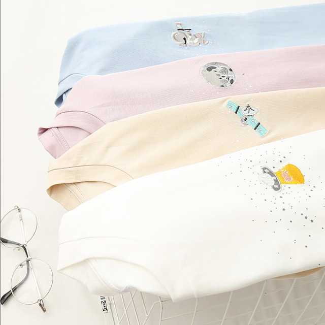 《入荷待ち》Tシャツ パステルカラー 半袖 ラウンドネック 個性的 刺繍 可愛い キュート 宇宙モチーフ UFO 惑星 彗星 宇宙服 宇宙探査機 ゆるかわ 人気 春 夏