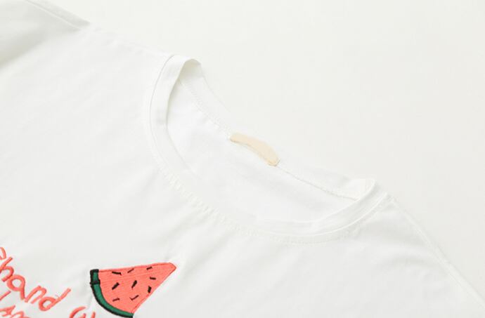 夏らしいスイカの刺繍が目を惹くTシャツは、着まわしやすい定番ホワイトにとことんガーリーなピンクの2色展開。