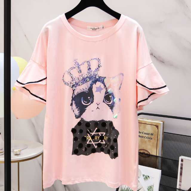 《再入荷》Tシャツ 猫 ネコ ねこ 半袖 キュート ガーリー 可愛い スカラップ ラウンドネック ロングテール スリット パステルカラー 人気 春 夏