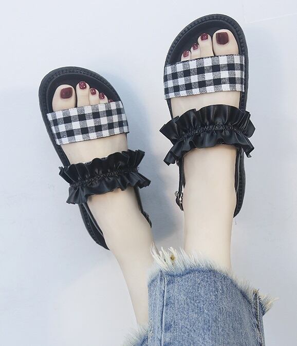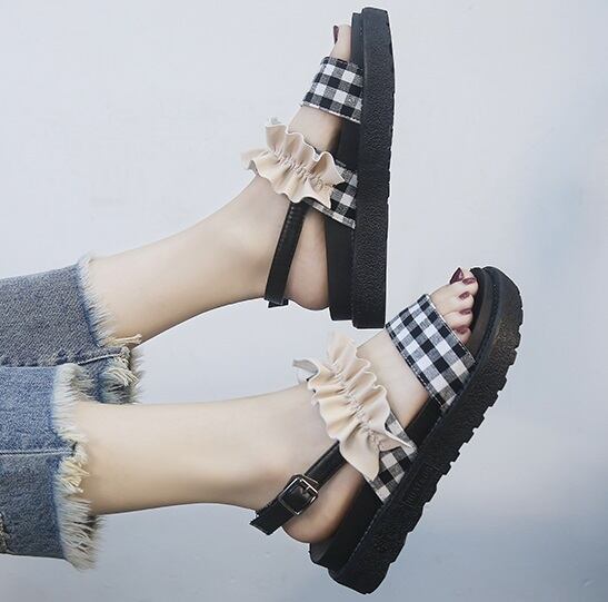 《入荷待ち》サンダル フラットサンダル プラットフォームサンダル 大きいサイズ ギンガムチェック フリル アンクルストラップ ローヒール 楽ちん 夏