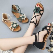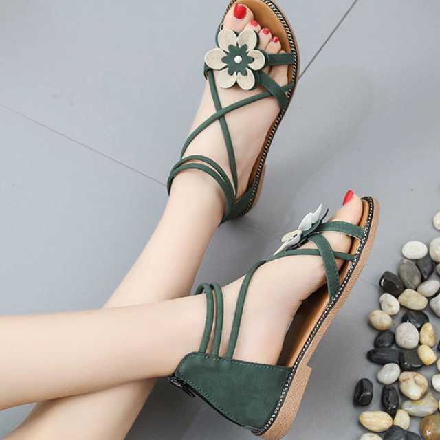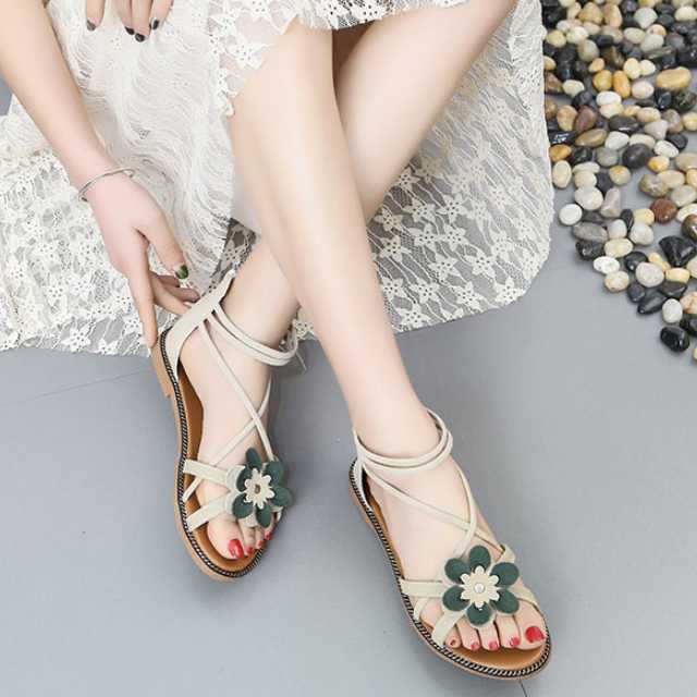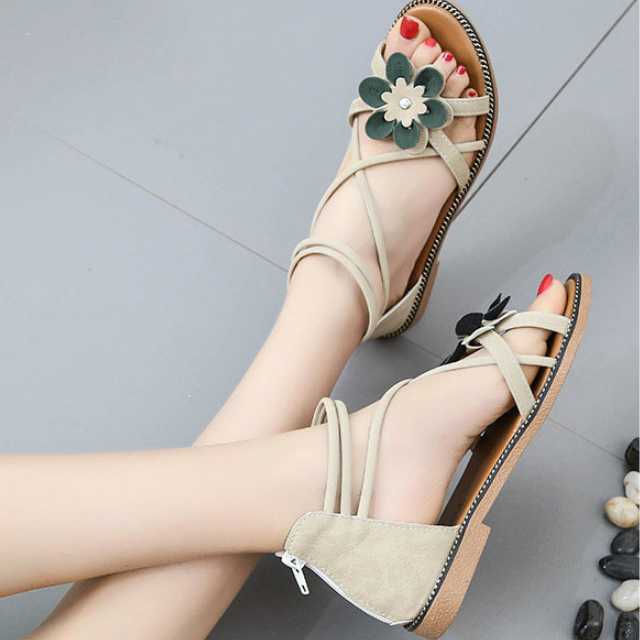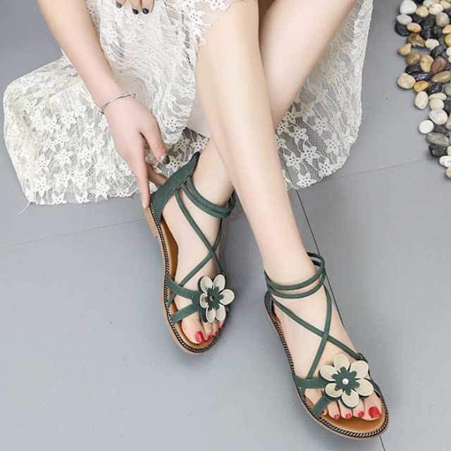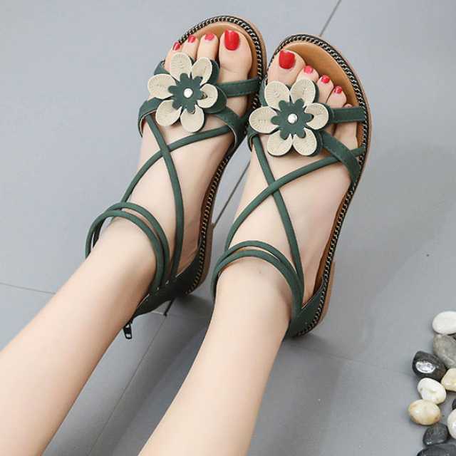 サンダル フラットサンダル 大きいサイズ フラワーモチーフ バックファスナー アンクルストラップ 楽ちん ローヒール 夏 春