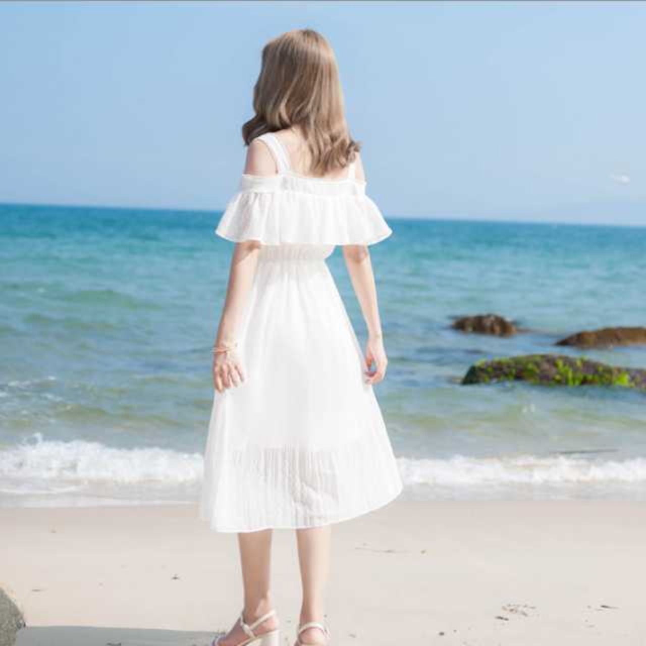 《入荷待ち》夏 ワンピース オープンショルダー ハイウエスト ギャザー フレア 爽やか リゾートワンピース オフショルダー ガーリー 大人可愛い キュート デート ミディ丈 ミモレ丈 小さいサイズ