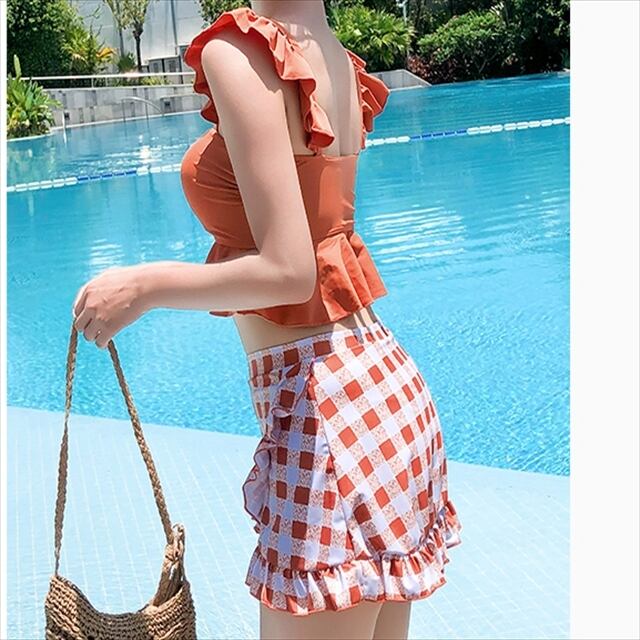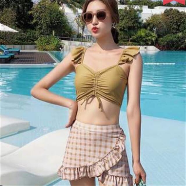 《再入荷》 水着 新作 夏 海 プール グリーン ホワイト ブラック フリル チェック アシンメトリ スカート 可愛い 体型カバー ハイウエストボトム ガーリー キュート