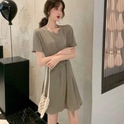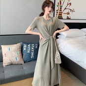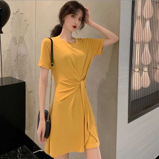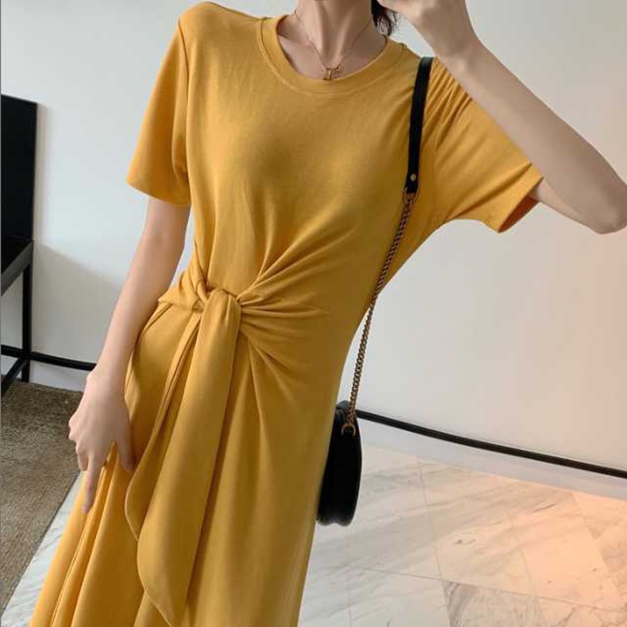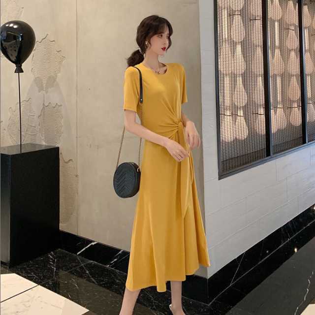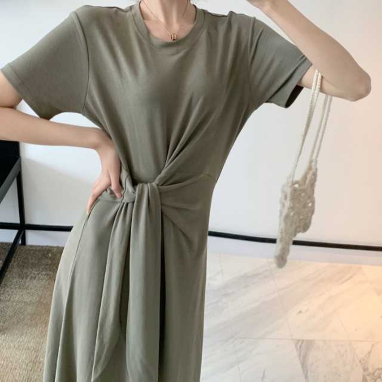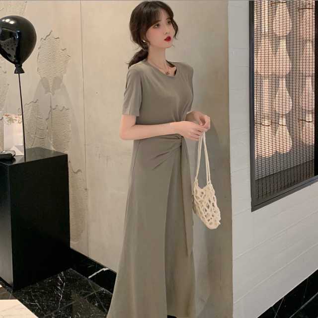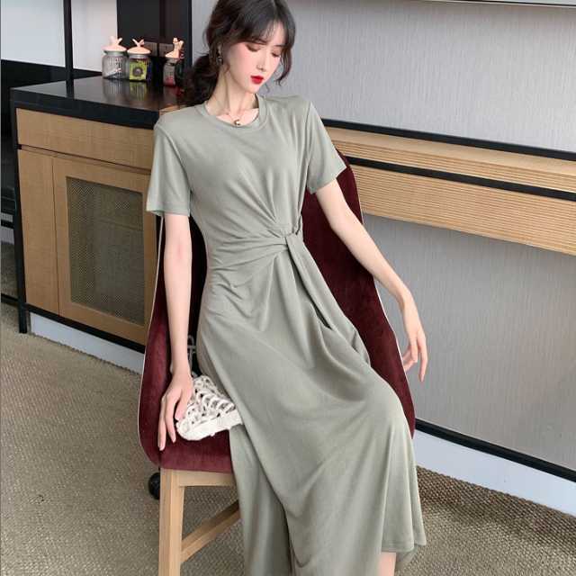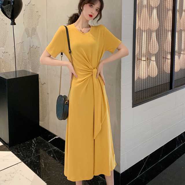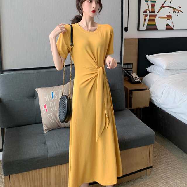 《入荷待ち》 ワンピース 着丈2種 半袖 春 夏 秋 ギャザー 個性的 シンプル 無地 オシャレ こなれ ミニ丈 ロング丈 リボン ウエストマーク ハイウエスト スタイルアップ 足長効果 美シルエット 大人女子 ゆったり 楽ちん