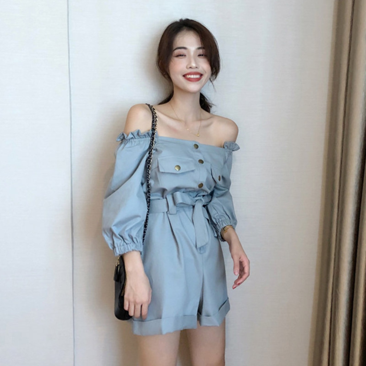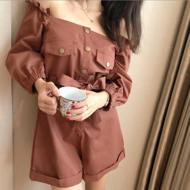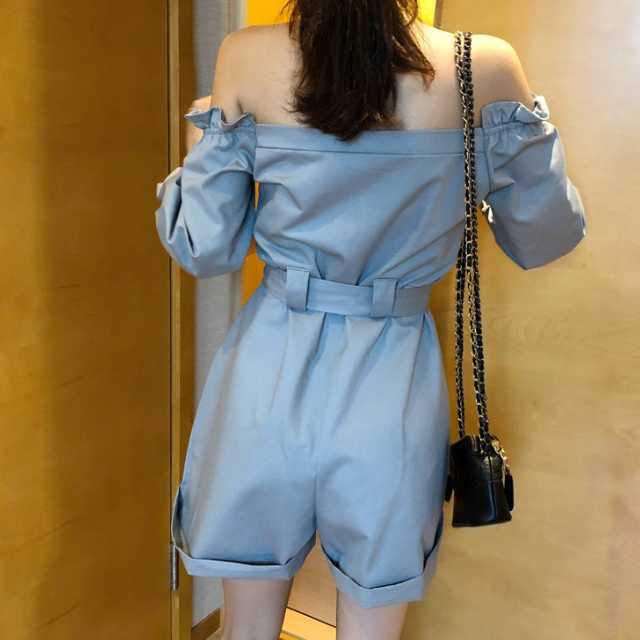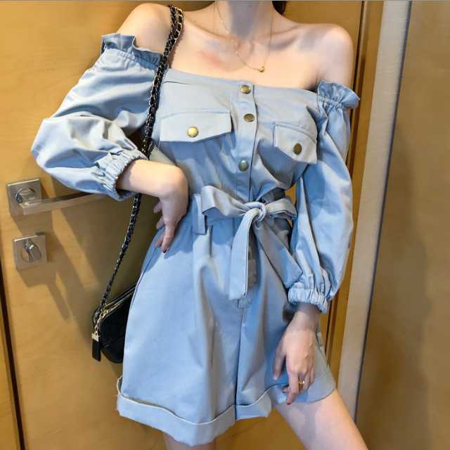 《入荷待ち》ジャンプスーツ ショートパンツ オフショルダー オールインワン ワンピース 可愛い キュート カジュアル オシャレ フロントボタン リボン ウエストマーク ハイウエスト スタイルアップ パフスリーブ バルーンスリーブ