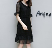 《再入荷》ワンピース ひざ丈 5分袖 レース シースルー Vネック フリル ドット柄 可愛い パーティードレス レディース