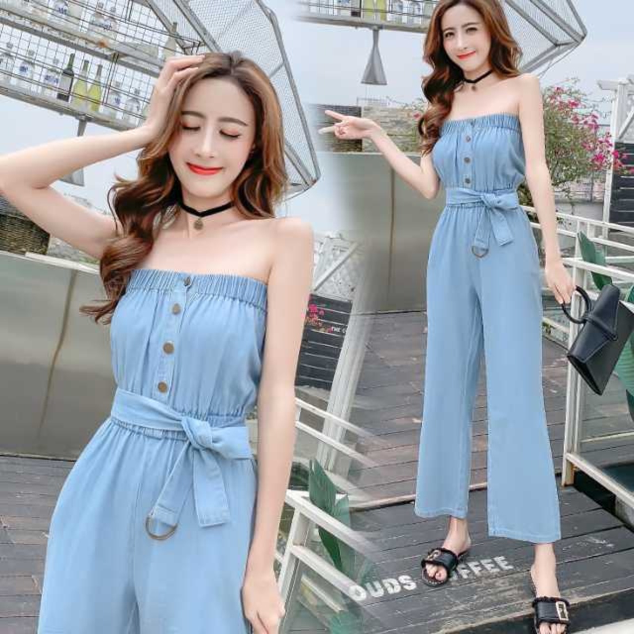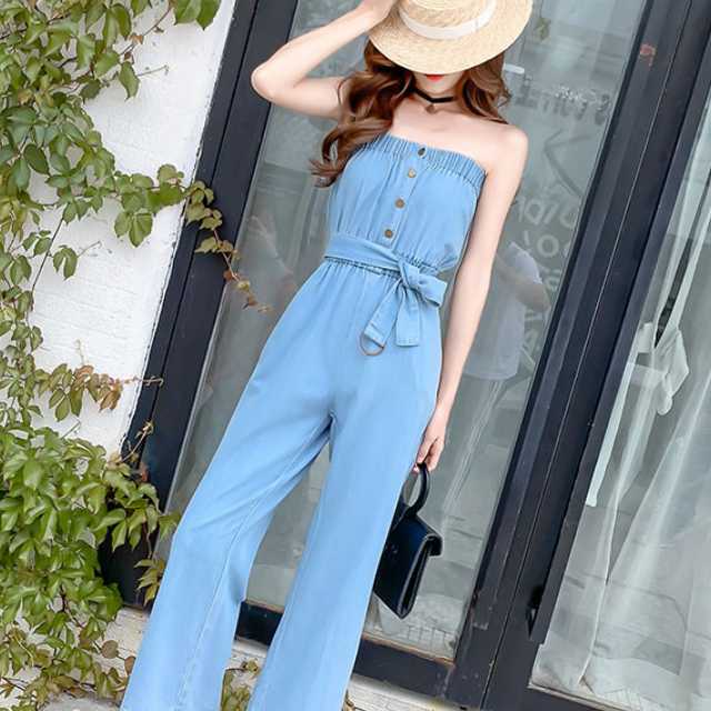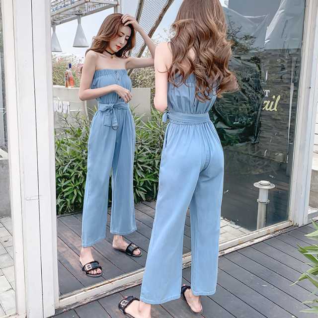 《入荷待ち》ジャンプスーツ つなぎ デニム カジュアル ベアトップ フロントボタン オシャレ 楽ちん 大人可愛い キュート デート ウエストマーク リボン アンクルパンツ 春 夏 女子会 美スタイル スタイルアップ 足長効果 ライトブルー 水色 レディース