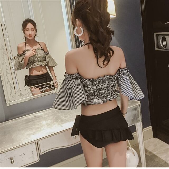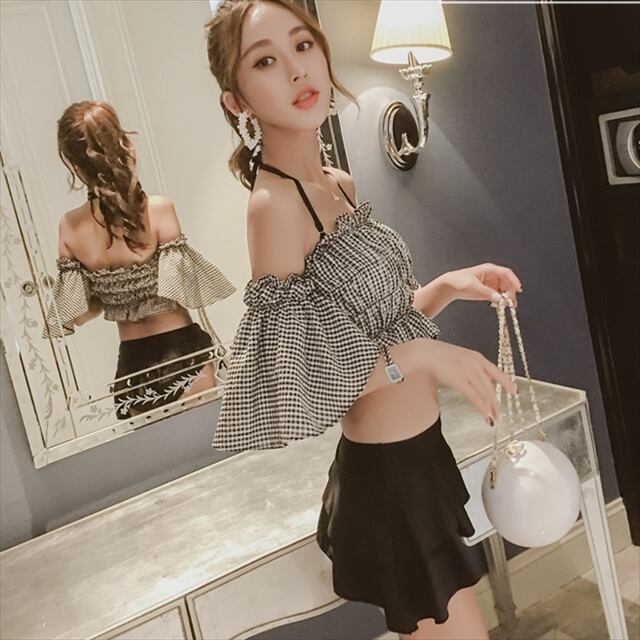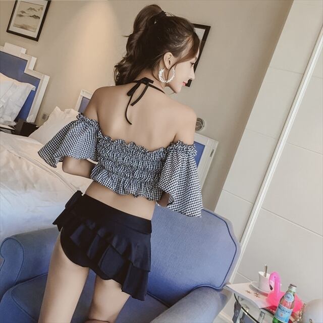 【入荷待ち】水着 夏 海 プール ビキニ チェック フリル 袖付き しぼり スカート アシンメトリ 足長 美脚 大人可愛い スイムウェア ツーピース 体型カバー ホルターネック オープンショルダー シャーリング ビーチ リゾート