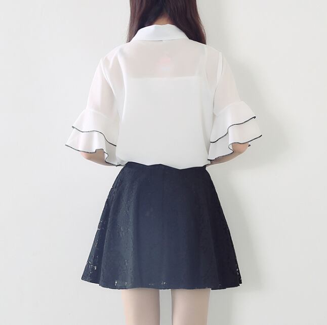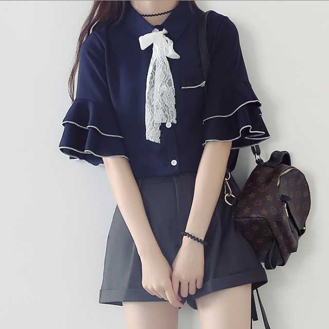 《再入荷》ブラウス シャツ ベルスリーブ ティアードフリル リボンタイ ガーリー 大人可愛い キュート クラシカル 清楚 デート 通学 バイカラー ツートン レース フリル 秋 春