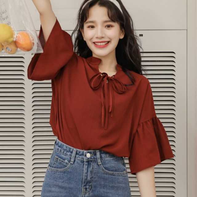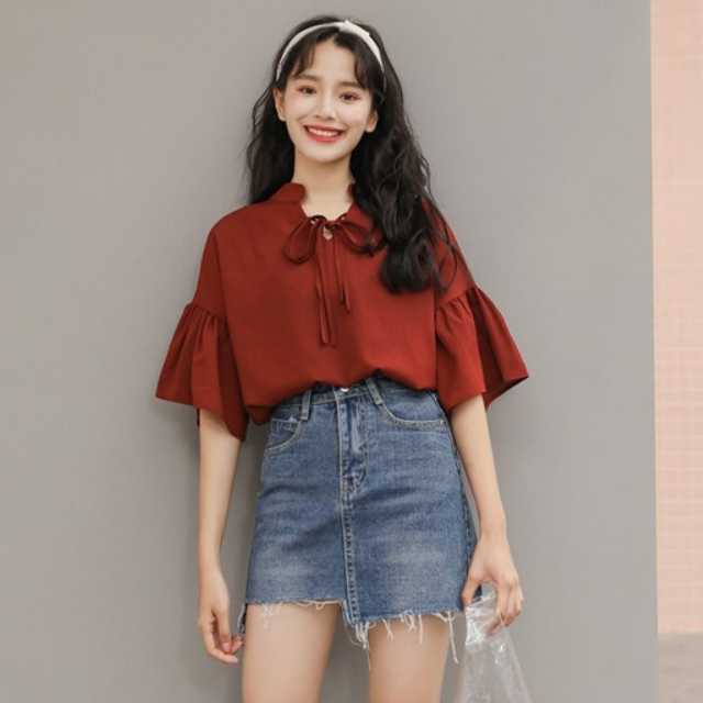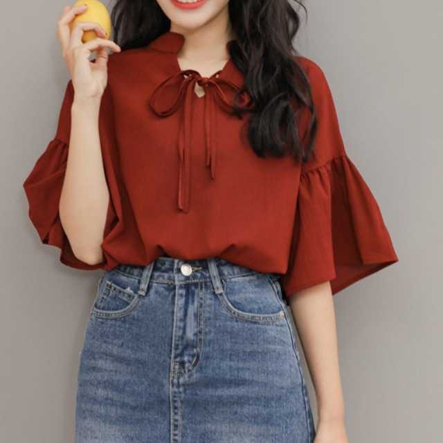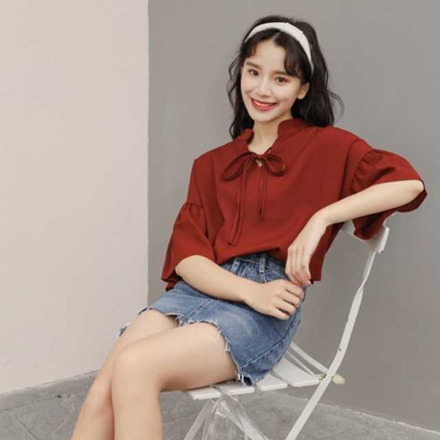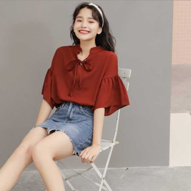 秋色 リボン カットソー トップス 半袖 ベルスリーブ 華奢見え シフォン レトロ 大人可愛い キュート ガーリー 通学 デイリーコーデ デート 無地 シンプル フレア 人気 オススメ