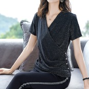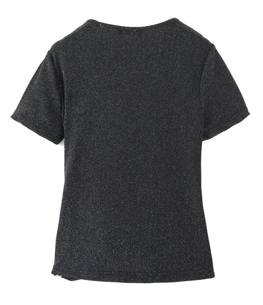 《入荷待ち》Tシャツ トップス カットソー 半袖 ラメ Vネック 綺麗 エレガント サイドボタン 上品 無地 シンプル レディース 大きいサイズ カシュクール