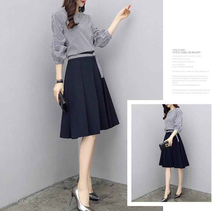 《入荷待ち》 ブラウス 7分袖 ラウンドネック スカート ひざ丈 Aライン セットアップ 可愛い オフィスカジュアル お出掛け 大きいサイズ 20代 30代 レディース