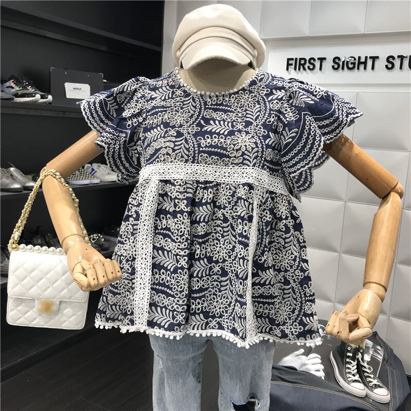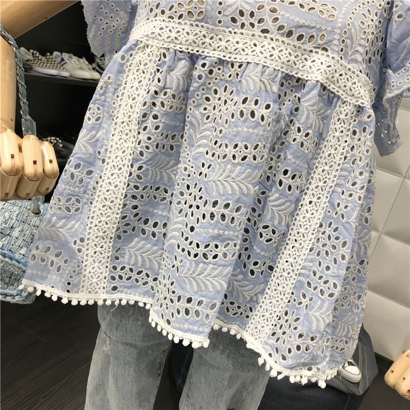 《入荷待ち》ブラウス 半袖 レース 刺繍 可愛い ラウンドネック フェミニン カジュアル トレンド 夏 春 フレア ワンサイズ シンプル レディース