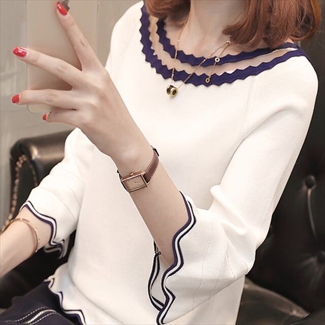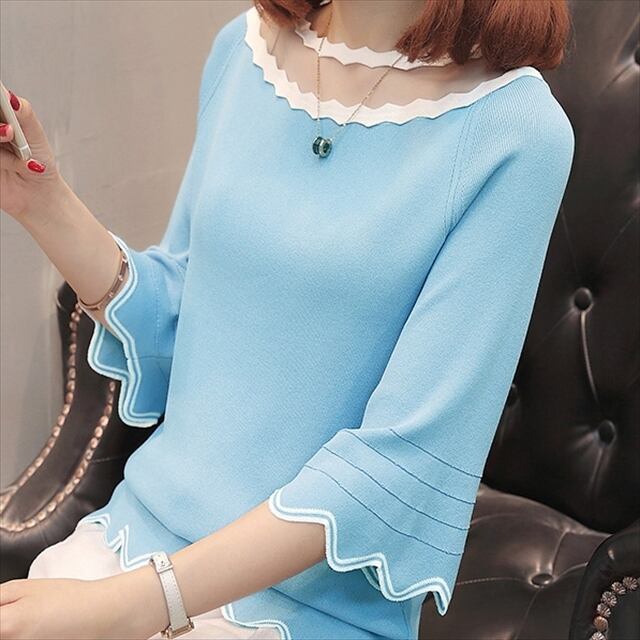 《入荷待ち》セーター 全5色 シルク ラウンドネック 春秋7分袖 ベルスリーブ ゆったり レース シンプル カジュアル オフィス 清楚 大人可愛い