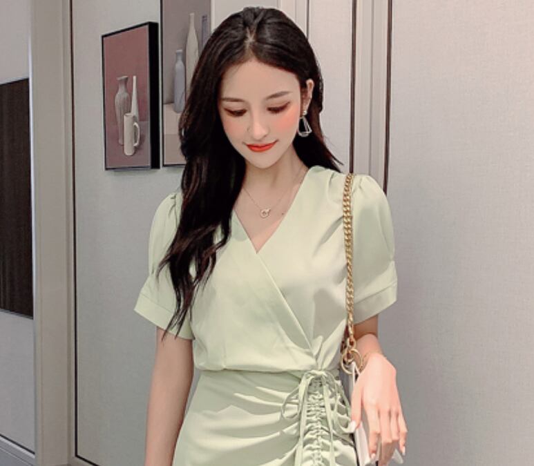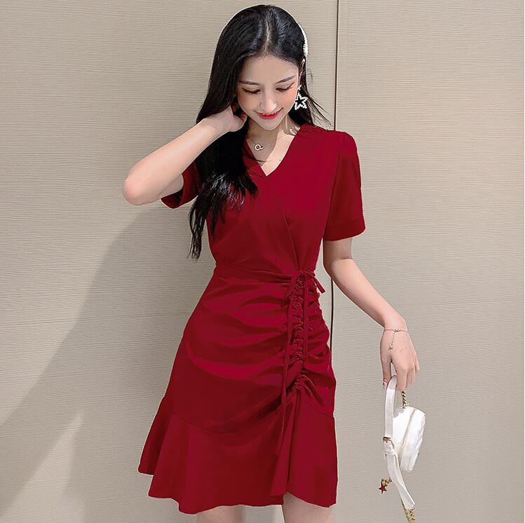 《入荷待ち》ワンピース Vネック 半袖 ひざ丈 リボン 上品 可愛い 無地 シンプル エレガント パーティ デート お出掛け レディース