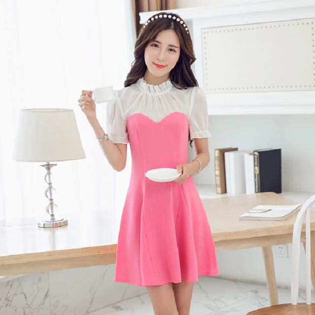 《入荷待ち》プチプラ ワンピース 半袖 ミニ丈 ハイネック レース シースルー フレア ソリッドカラー 無地 フェミニン 二次会 パーティー 女子会 レディース 大きいサイズ