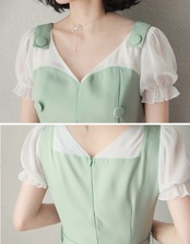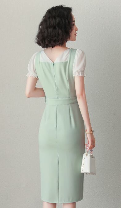 《入荷待ち》ワンピース 半袖 レース タイト ウエストベルト フレア スリット スカート シースルー 可愛い フェミニン ソリッドカラー グリーン レディース キュート ミント