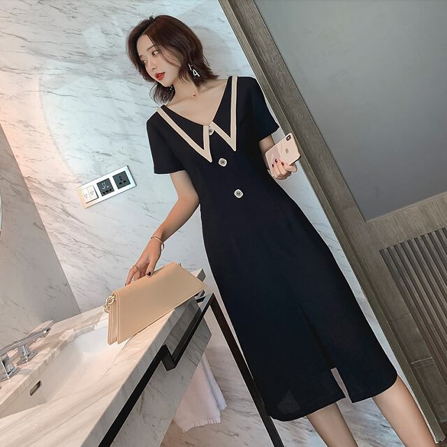 《入荷待ち》ワンピース 膝丈 Vネック 半袖 ライン 襟 スリット モード レトロ 可愛い シンプル 大人 お出掛け デート 二次会 お洒落 レディース