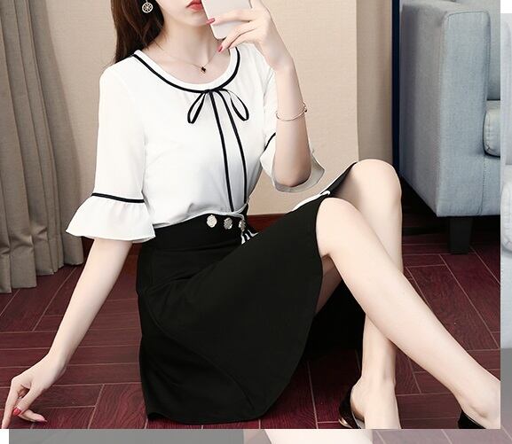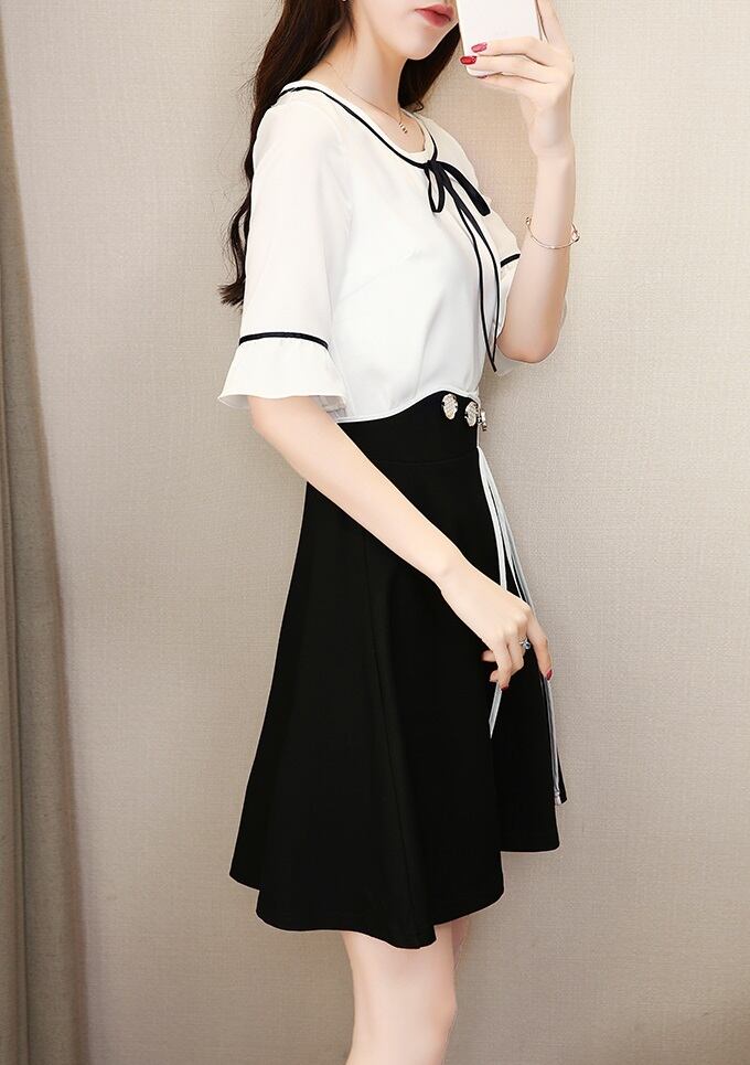 《入荷待ち》 セットアップ 半袖 ブラウス フリル フレアスカート ツーピーススーツ ドレス リボン ライン 新作 夏 秋 大人 上品 ガーリー 可愛い レディースファッション モノトーン 白黒 バイカラー ハイウエスト