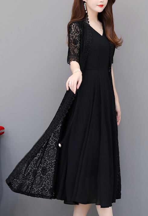 《入荷待ち》ワンピース ノースリーブ Vネック ミディ丈カーディガン レース ロング丈 5分丈 パーティドレス 透け感 sexy 上品 パーティー 可愛い 大きいサイズ レディース