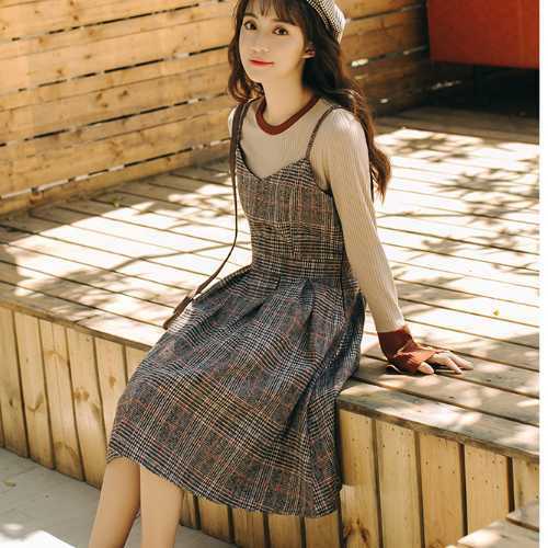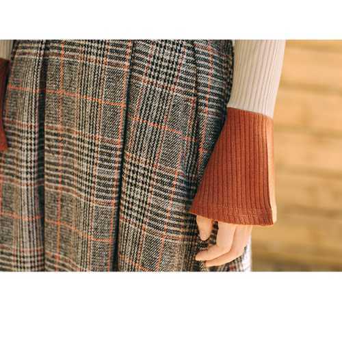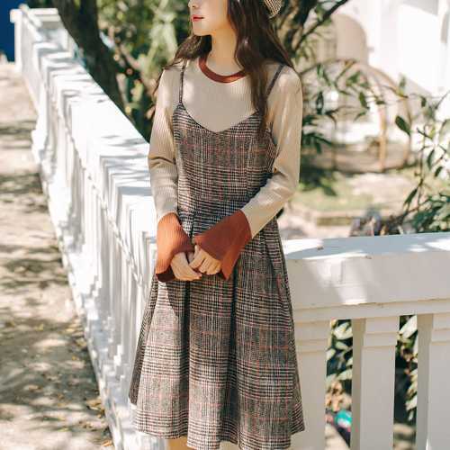 《入荷待ち》ツーピース ワンピース チュニック ウール サスペンダー スカート トップス ワンピース ドレス レトロ オレンジ ブラウン グレー チェック柄 サスペンダー 秋 冬 長袖 フェミニン デート カジュアル レディース