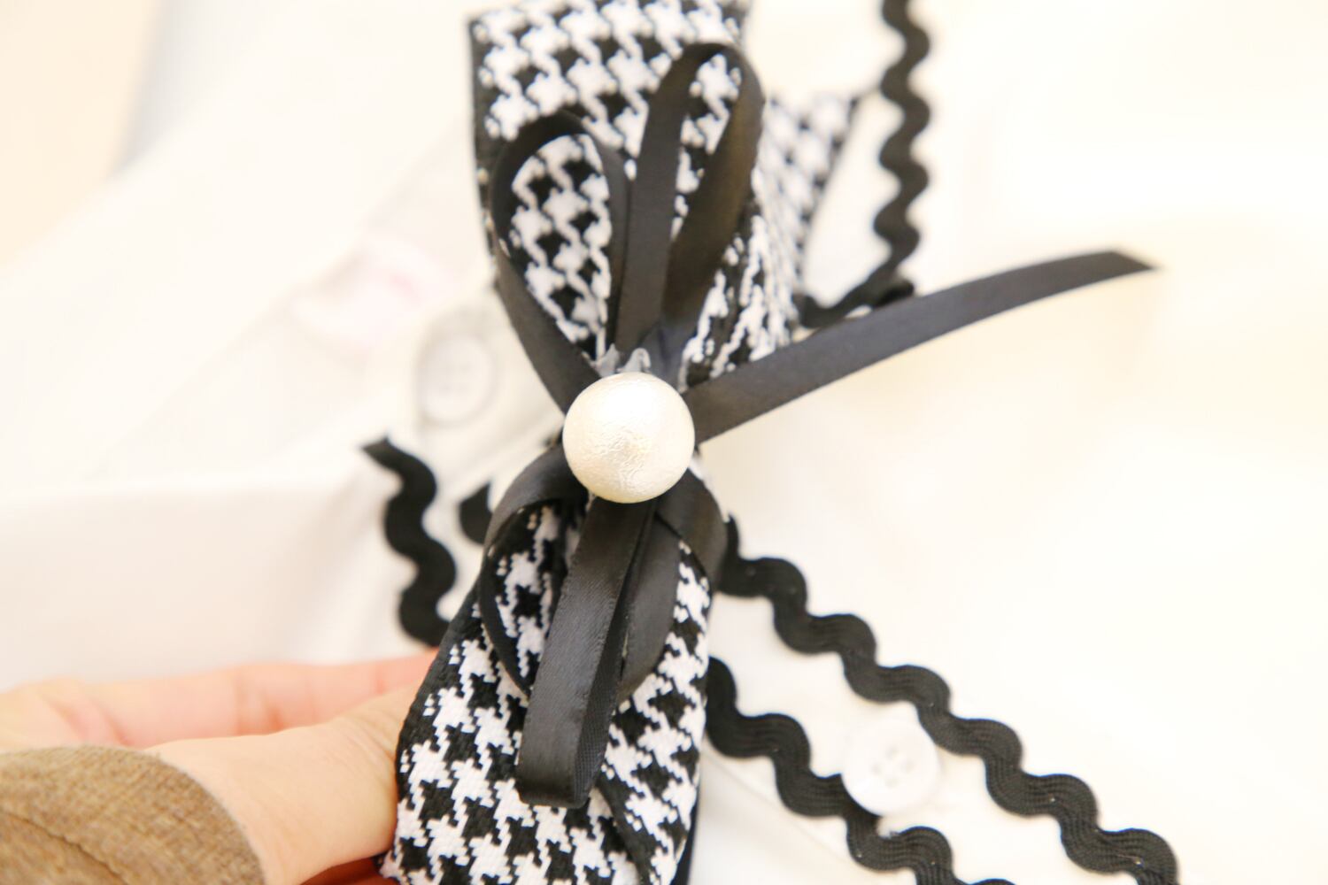 チェック柄のリボンと袖口・シャツのフリルが女性らしさを強調してくれます♪