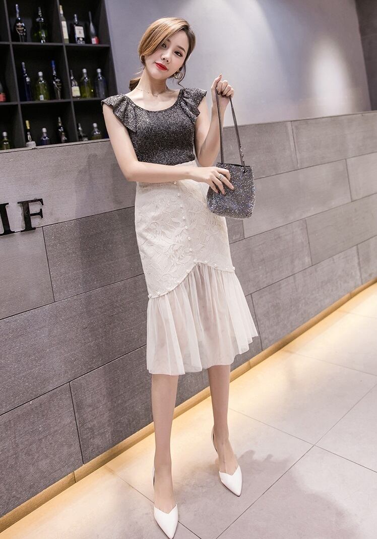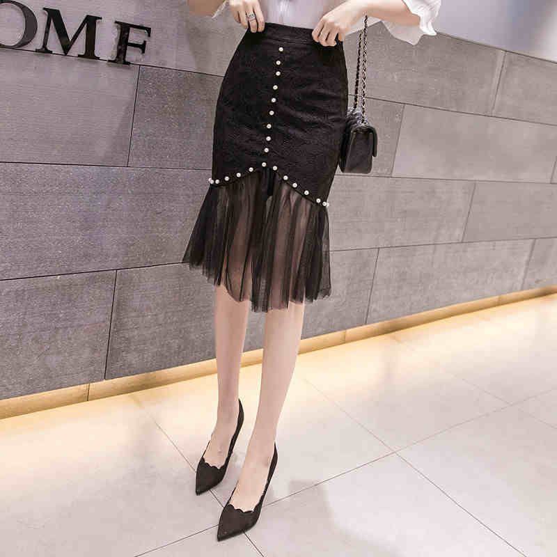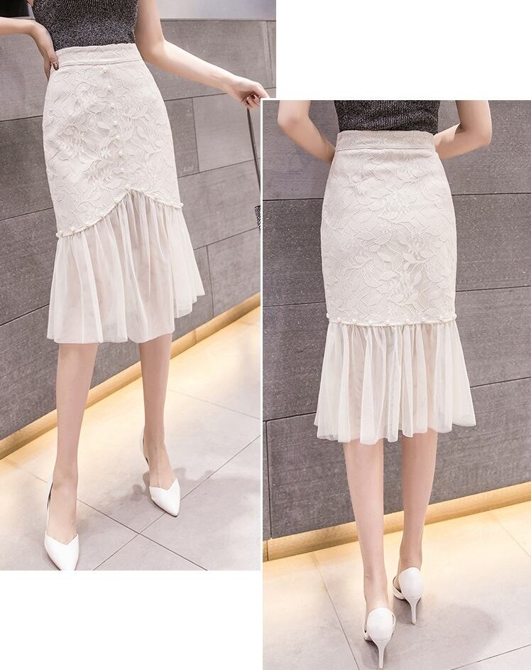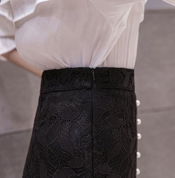 《入荷待ち》スカート レース 膝丈 パール フリル ポケット ボタン 秋 花柄 ミニ丈 ハイウエスト 脚長 デート お呼ばれ パーティー レディース キレイめ