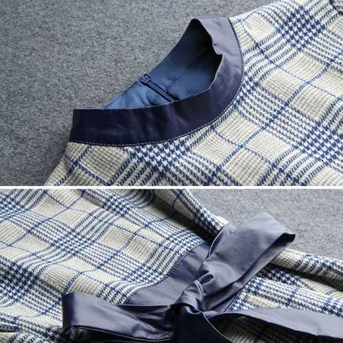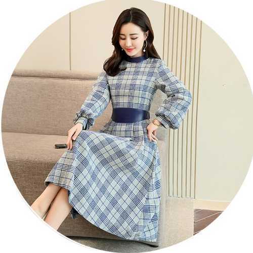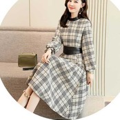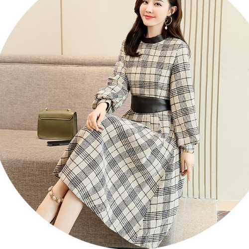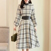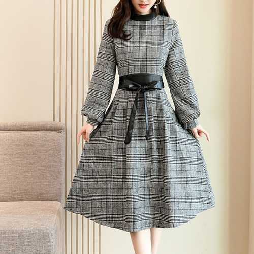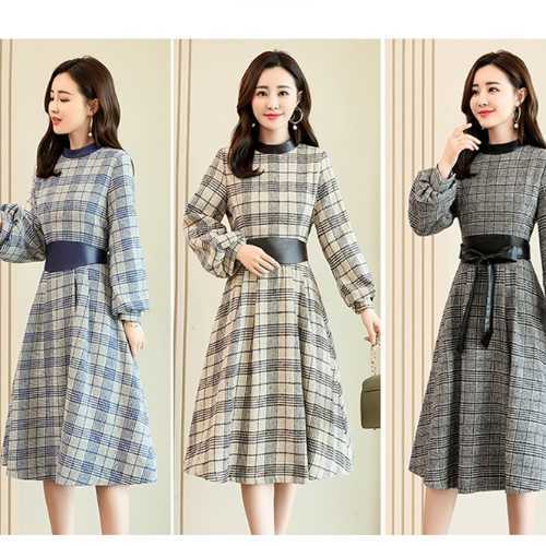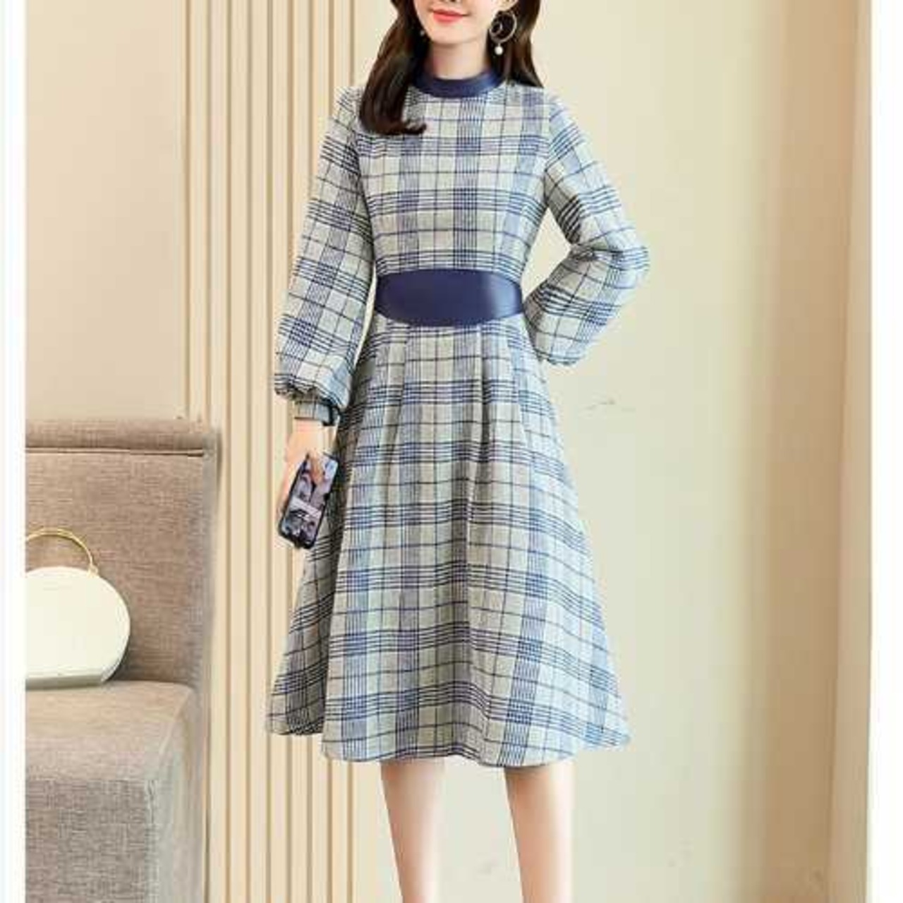 《入荷待ち》全3色 ワンピース ドレス チェック柄 長袖 バルーン袖 膝丈 ミディ丈 フレア Aライン ハイウエスト 大人 上品 お呼ばれ パーティー デート 二次会 グレー ベージュ ネイビー レディース