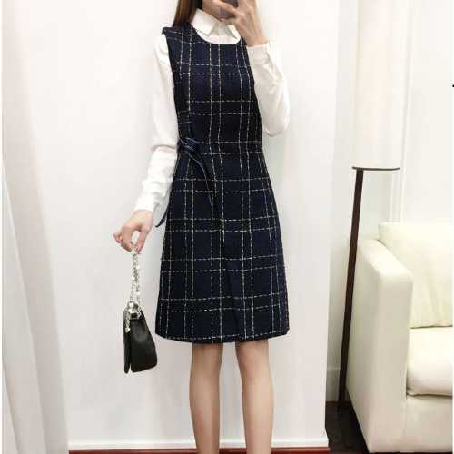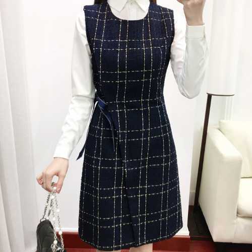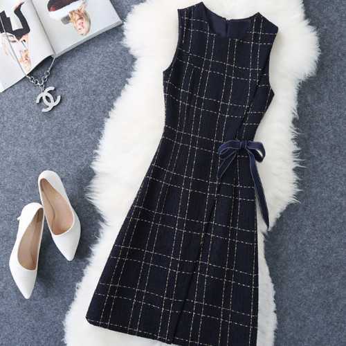 大きいサイズ ワンピース ウール チェック柄 ドレス リボン ネイビー クルーネック タイト スタイリッシュ ノースリーブ 膝丈 秋 冬 大人 かわいい 上品 シック お呼ばれ パーティー 二次会 デート レディース
