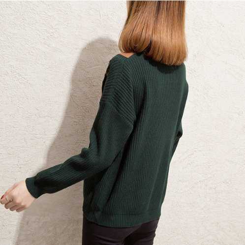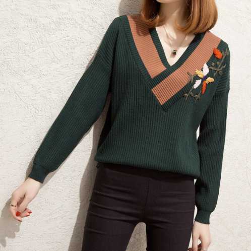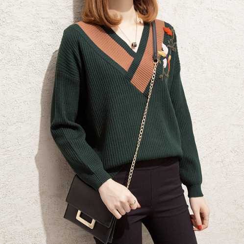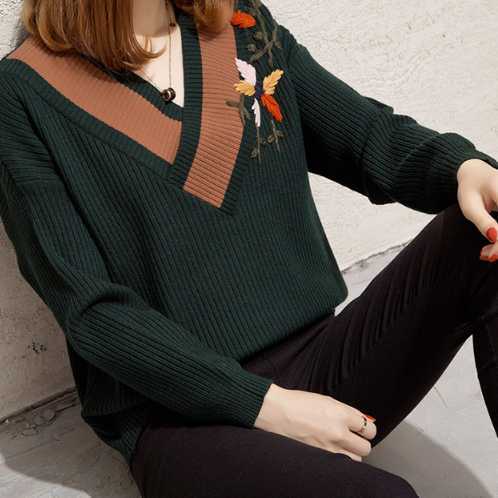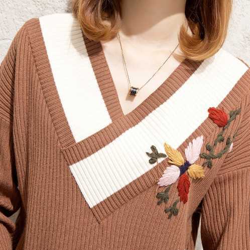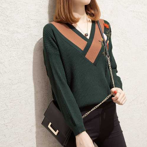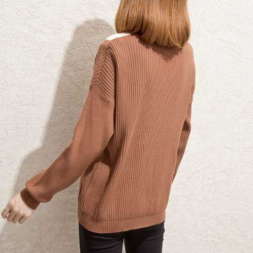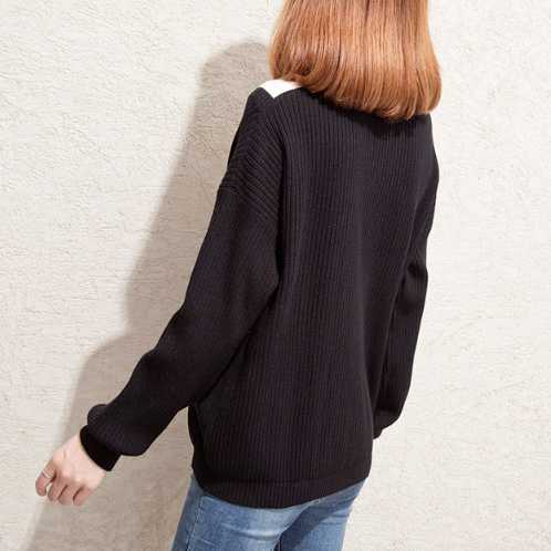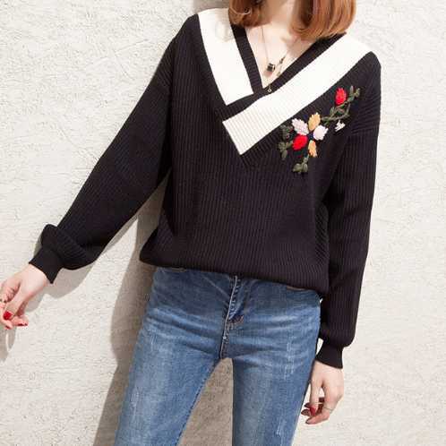 《入荷待ち》 Vネックセーター バイカラー リブ 刺繍 長袖 オーバーサイズ 秋 冬 新作 セクシーカジュアル 大人 かわいい 通勤 通学 女子会 レディース
