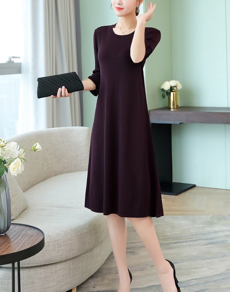 《入荷待ち》ワンピース ロングスカート 五分丈 ラウンドネック 新作 秋 冬 シンプル デート お出かけ パーティー 演奏会 お呼ばれ 通勤 レディース 無地