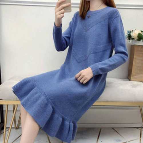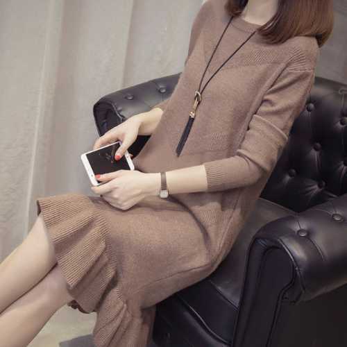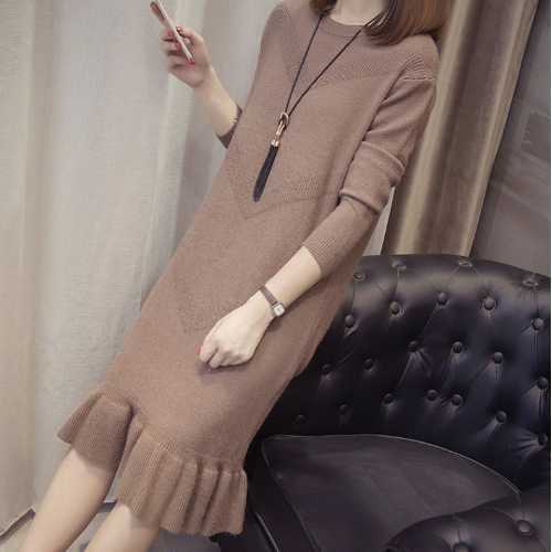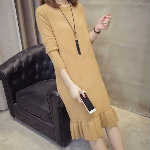 《入荷待ち》大きいサイズ ワンピース ニット セーター スカート 裾フリル プリーツ 無地 ラウンド ネック 長袖 リブ 膝丈 あったか かわいい 大人 フェミニン ガーリー デート 新作 秋 冬 レディース